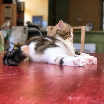 Elle est adorable en tout. Elle a un regard très particulier, on dirait le chat botté! Sa robe tortie blotched est ce dont je rêvais depuis plusieurs années ! Niveau caractère, c'est une petite crème. Nous avons tous les jours des ronrons et des câlins interminables. Elle est aussi très joueuse mais toujours tendre et douce dans ses gestes.